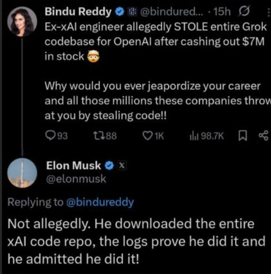 马斯克在X平台上愤怒指责,李学晨在离职前下载了xAI的整个代码库!登录日志证明了这一点,而他也承认了!