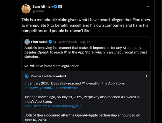 5、2025年8月,起诉苹果和OpenAI涉嫌垄断,通过”反竞争手段“来打压AI竞争对手,声称苹果在AppStore排名中偏向OpenAI,并降低xAI的社交媒体应用X和Grok的优先级